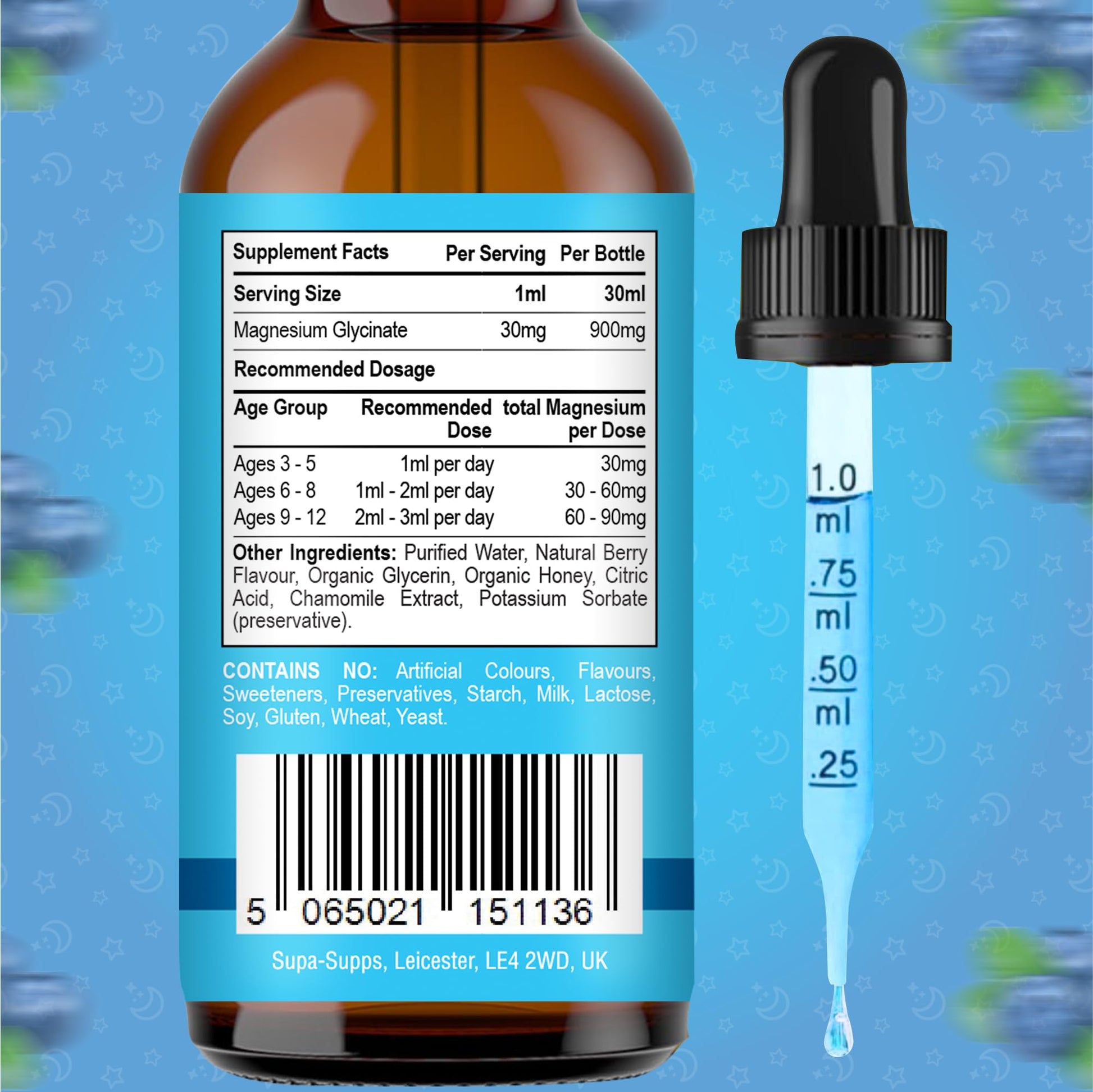 For children ages 3 and up, take the appropriate dosage based on age: - Ages 3–5: 1ml per day (30mg magnesium) - Ages 6–8: 1–2ml per day (30–60mg magnesium) - Ages 9–12: 2–3ml per day (60–90mg magnesium) Do not exceed the recommended dose unless advised by a healthcare professional. If your child has a medical condition or takes medication, consult a doctor before use.
