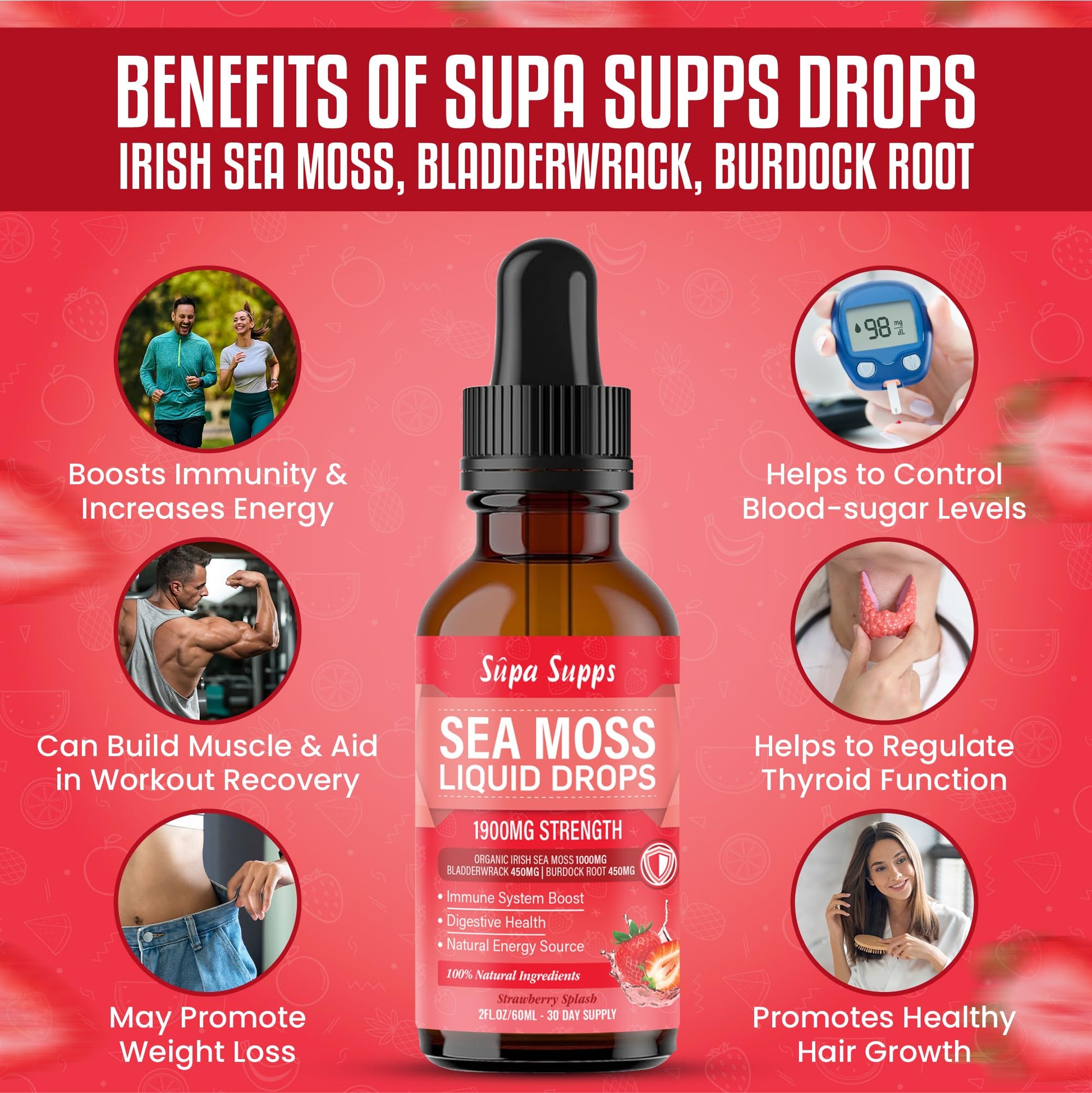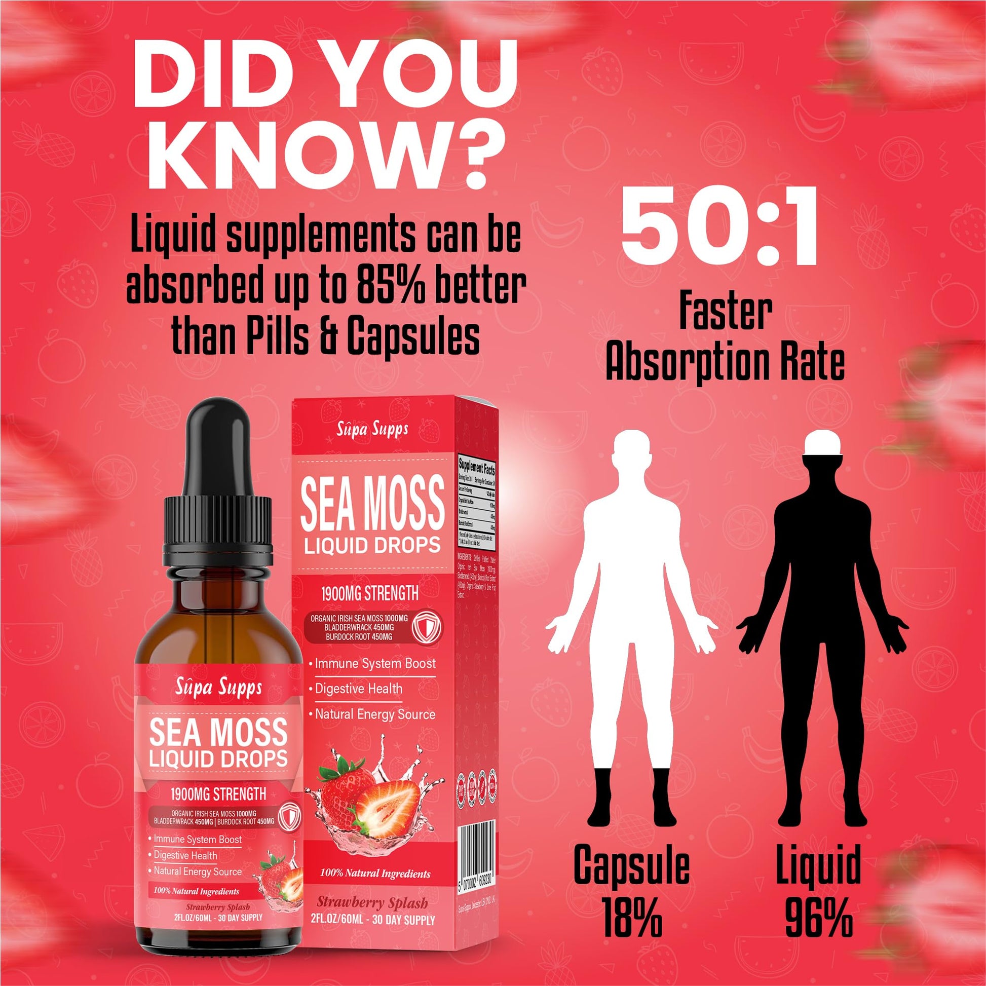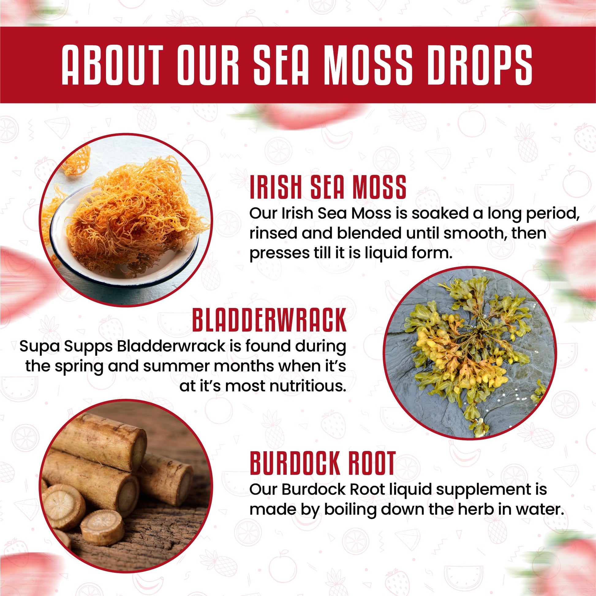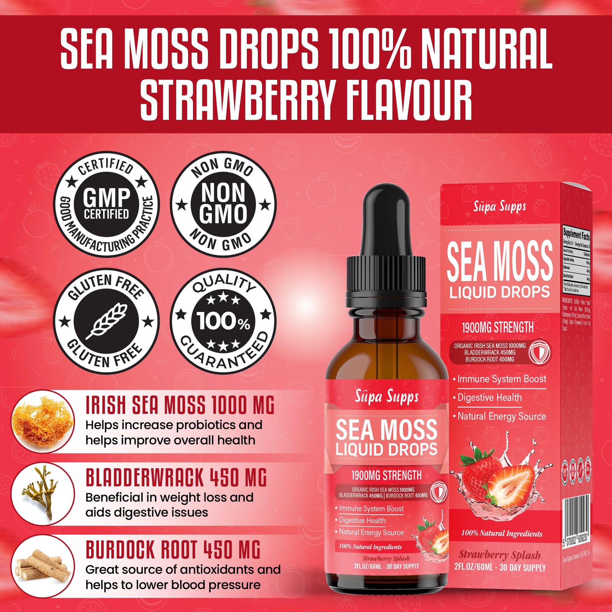 Distilled Purified Water, Organic Irish Sea Moss (1000mg), Bladderwrack (450mg), Burdock Root Extract (450mg), Strawberry & Lime Fruit Extract