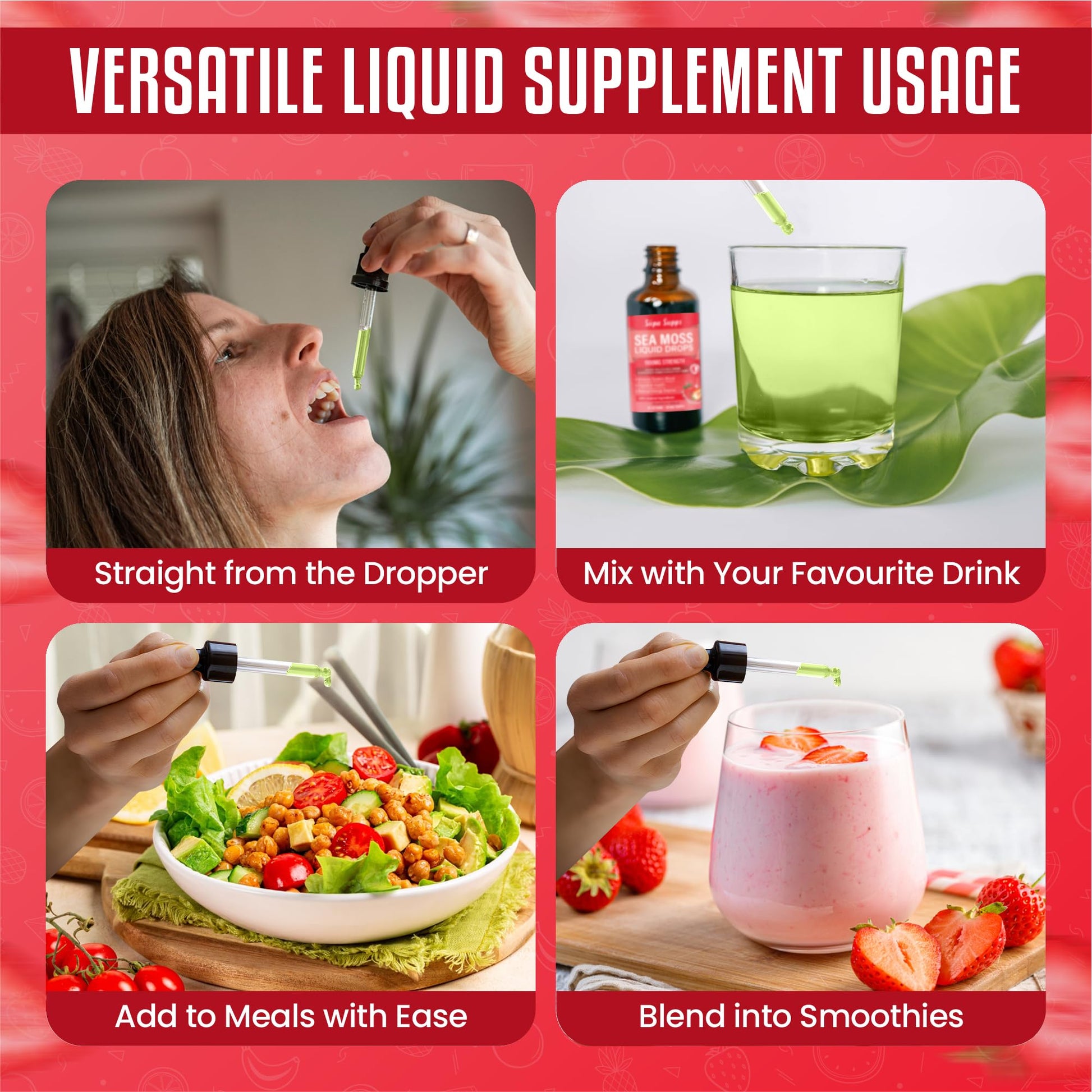 Shake well before use. Using the dropper provided, take 2ml per day. You can take it directly under the tongue for fast absorption or mix it with water, juice, tea, or a smoothie. For best results, take consistently at the same time each day. Do not exceed the recommended daily dose. If you are new to sea moss, you may start with a lower dosage and gradually increase to 2ml per day as needed.