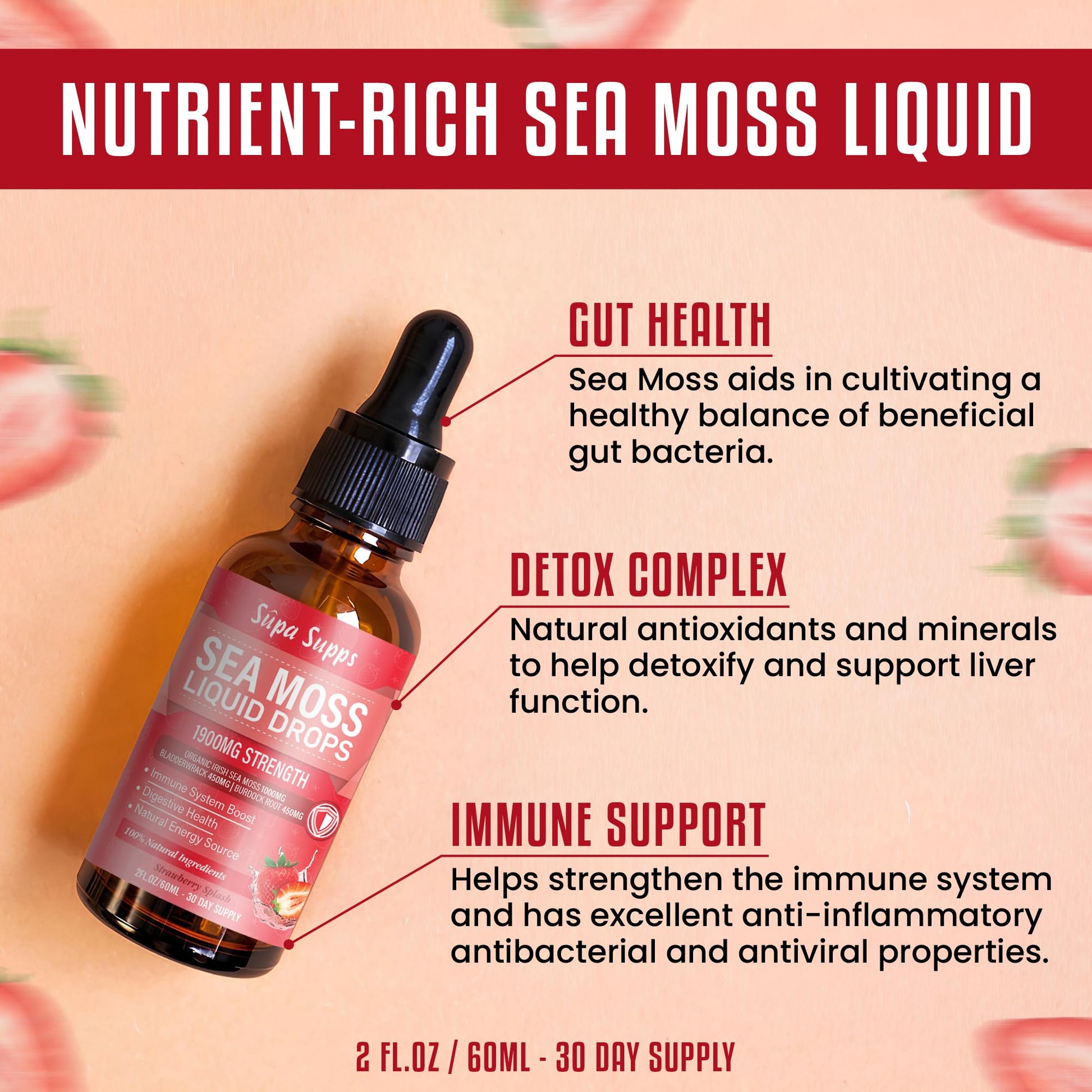Organic Sea Moss Liquid Drops 60ml – Irish Sea Moss Organic Supplement for Immune Support, Thyroid Health, Digestion, and Skin, Seamoss Supplements with Bladderwrack & Burdock Root Strawberry Flavour